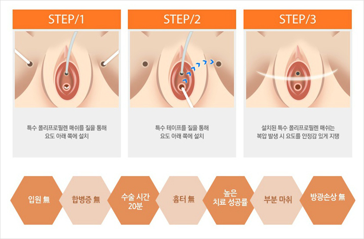 이들 수술은 기존 수술과는 달리 요도를 압박하지 않고 중부요도에 테이프를 걸어주는 방법입니다.